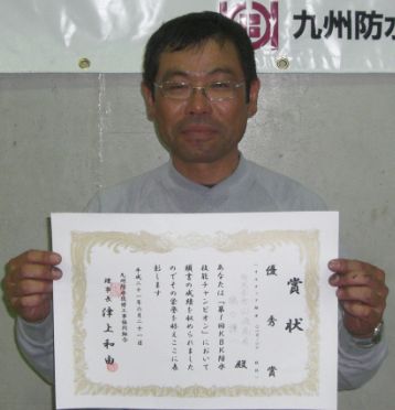 平成21年6月21日(日)福岡県立久留米高等専門校にて『第1回KBK防水技能チャンピオン決定戦』を開催致しました。例年若年層の研修会を中心に行ってきましたが技能員の一層のレベルアップをはかる為、ベテラン技能員同士の切磋琢磨・ベテランの腕前を若年層が生で見る機会を作ろうと企画しました。管理組合の方等一般応募も含め52名の方々に観戦頂きました。入賞者は以下の通りです。